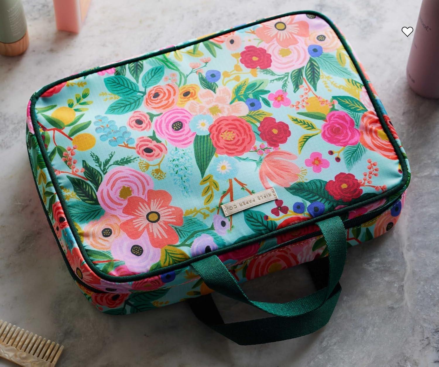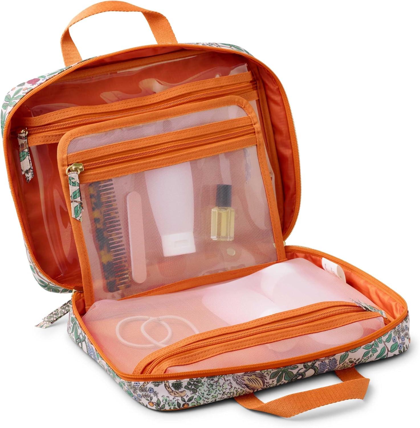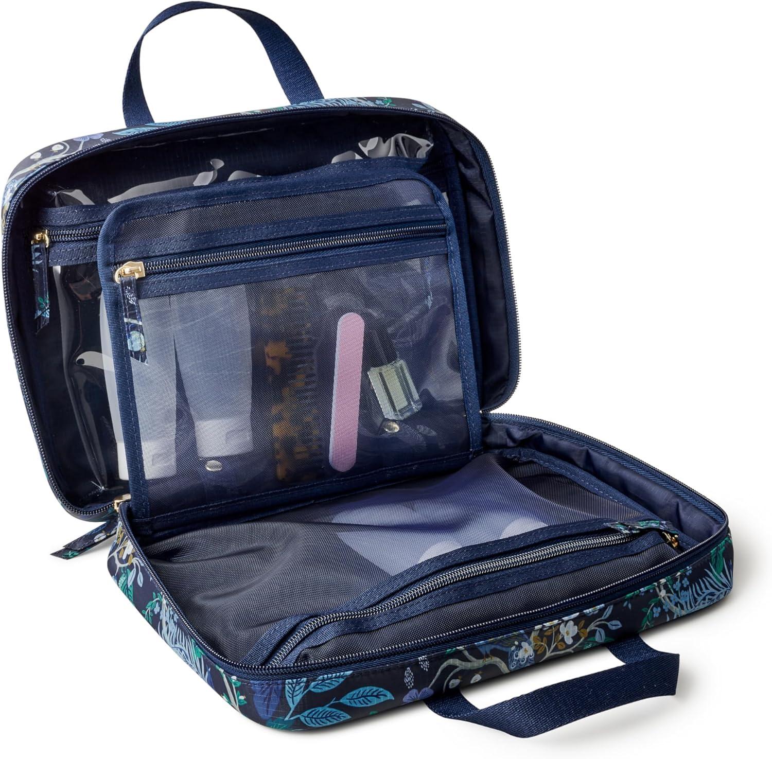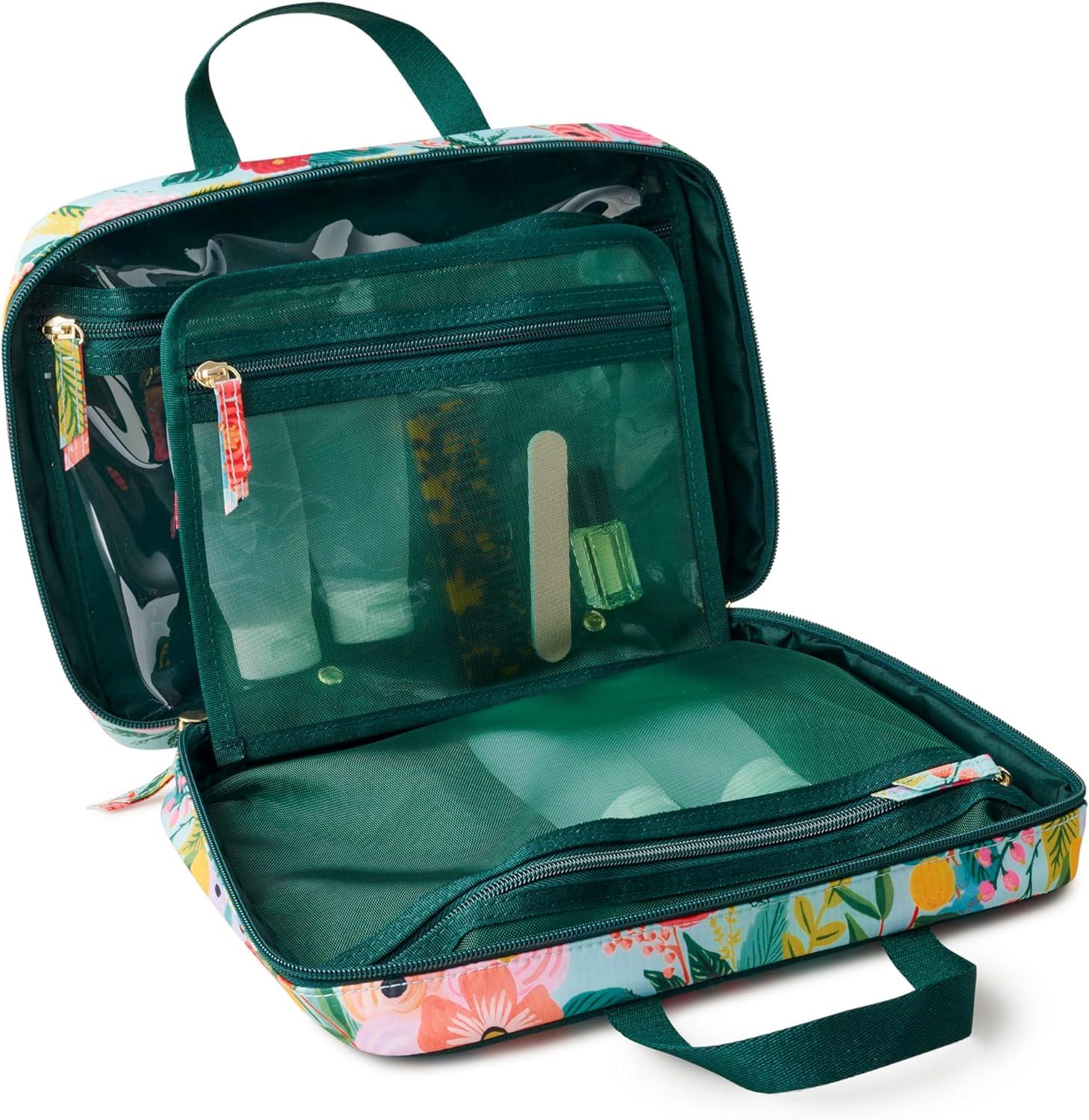 RIFLE PAPER CO. Travel Toiletry and Cosmetic Case | Multi Pocket Makeup Organizer Bag, Zipper Closure, Removable Clear Pouch, Lay Flat Design | Peacock Pattern(Garden Party)