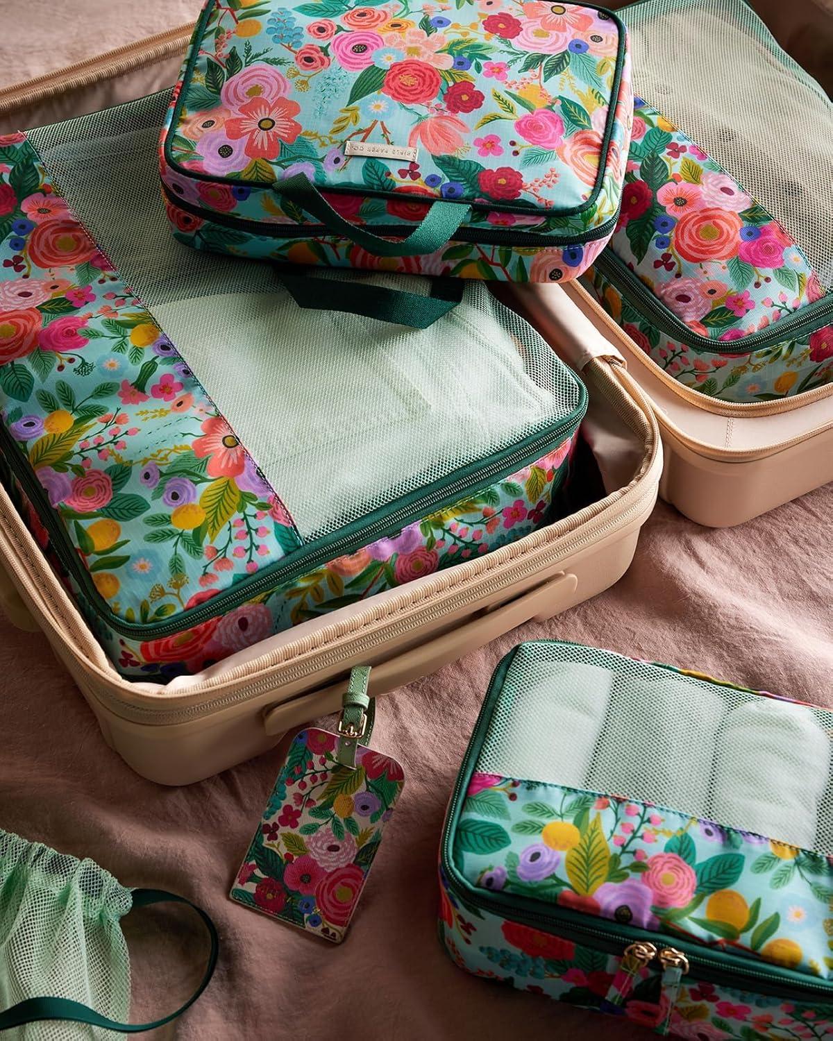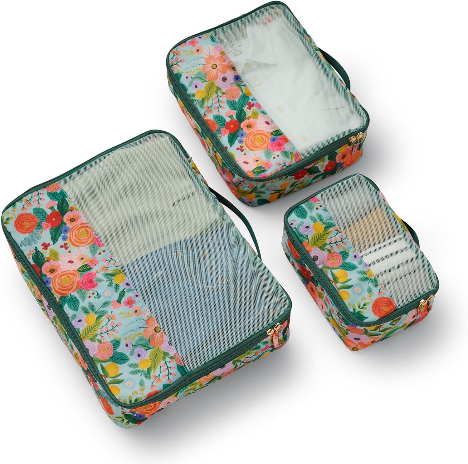 RIFLE PAPER CO. Soft Sided Packing Cubes Set of 3. Includes Small, Medium, Large and a Laundry Bag, Travel Must Have Accessory, Stylized Pattern, Floral Rosa(Garden Party)